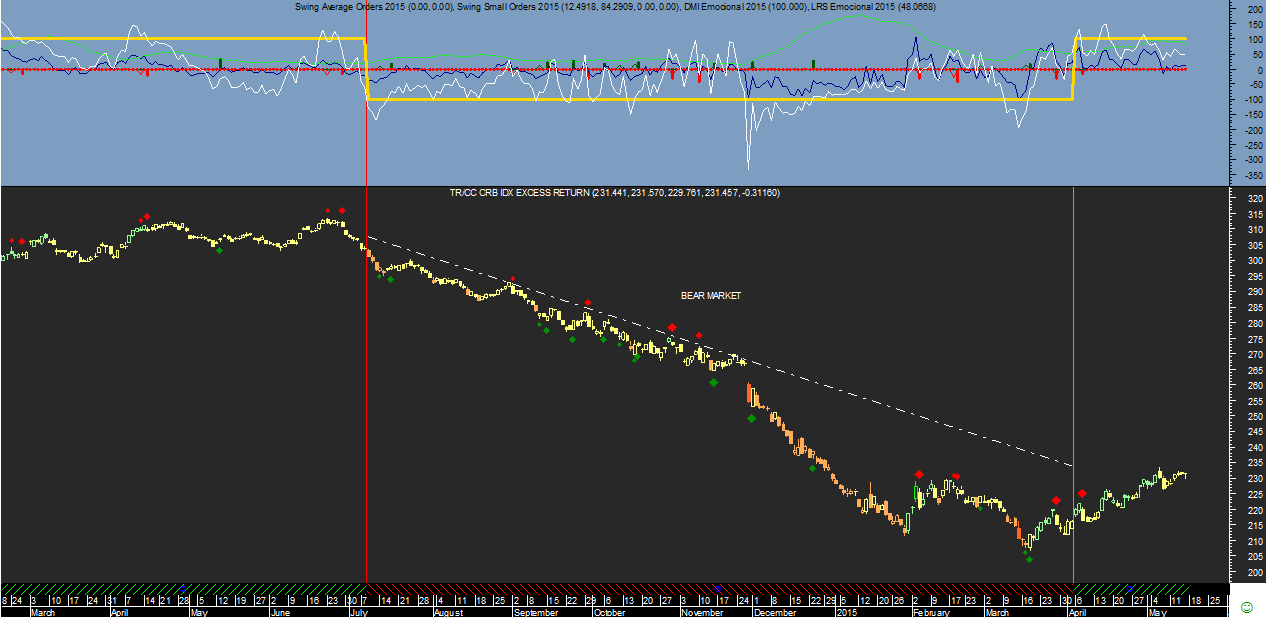 Curiosamente tratam-se de 5 casos de ameaça de alteração de sinal, todos sempre de compra ou mudança para o sentido ascendente, que coincide com o diagnóstico do índice CRB das commodities que desde finais de março aponta para uma recuperação das matérias-primas na escala diária e com o fim do respetivo bear market que temos testemunhado desde o início do 2º semestre do ano passado até ao primeiro trimestre do presente ano.