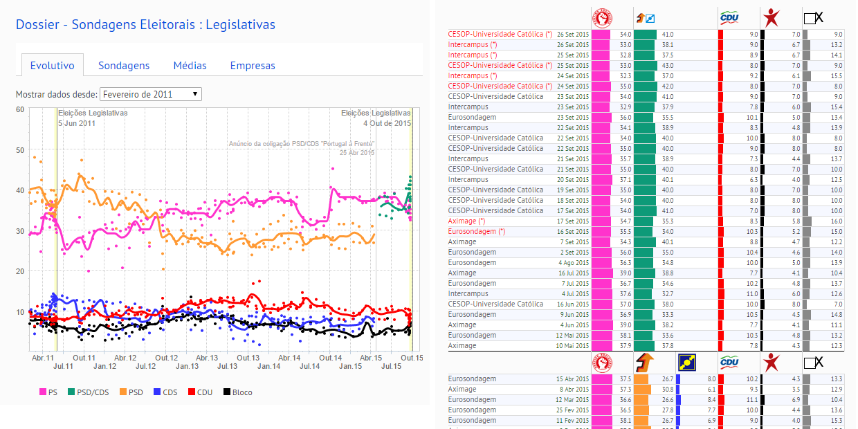 E o que as nossas sondagens andam sucessivamente a dizer é que temos a Coligação PaF nos 38-40% e o PS nos 34-36%, sem maiorias que se vislumbrem.