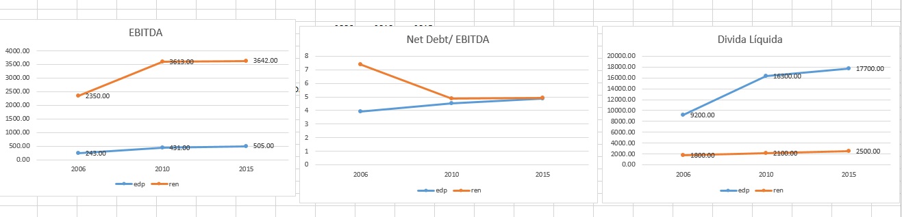 a divida cresceu nas duas mas cresceu mais na edp, relativamente ao aumento do ebitda numa e noutra, um ponto importante nos ganhos ou perdas nas ações são as expectativas e as da ren há algum tempo atras em 2007 eram altas demais a meu ver para uma empresa deste setor no entanto a empresa tem crescido bem melhor que a edp,dados em Milhões