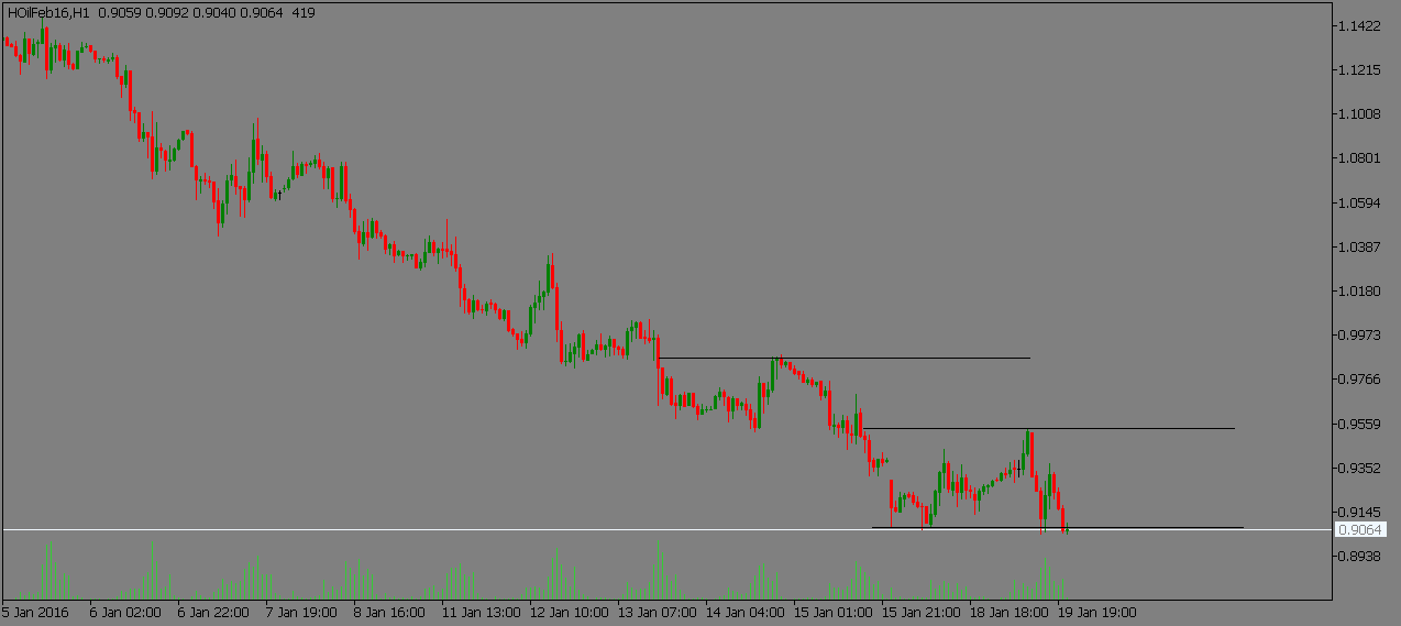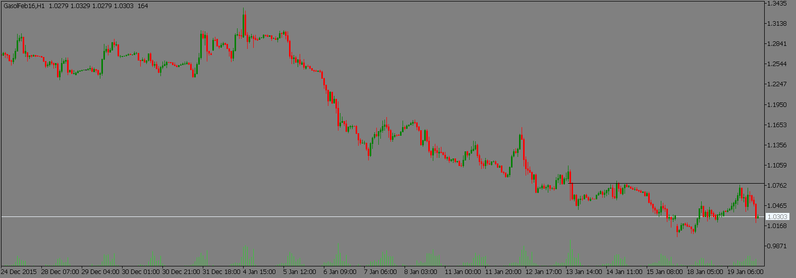 Como os cenários macro na gasolina e heating oil são semelhantes ao do petróleo, foquemo-nos no curto prazo com a leitura do gráfico horário. A partir de finais de Dezembro, a gasolina quebrou uma lateralização em baixa e acentuou um movimento descendente que ainda se mantém. Este padrão é bastante perceptível, por assentar numa sequência de lower-highs. Se no início do dia de hoje havia indícios que apontavam para uma eventual recuperação baseada num padrão de inversão, a activação do mesmo tem vindo a tardar e pode mesmo já não acontecer. Fica, ainda assim, a marca dos 1,08 dólares como grande referência de negociação. A sua quebra em alta significará com alguma probabilidade um ressalto que se poderá estender ao gráfico diário.