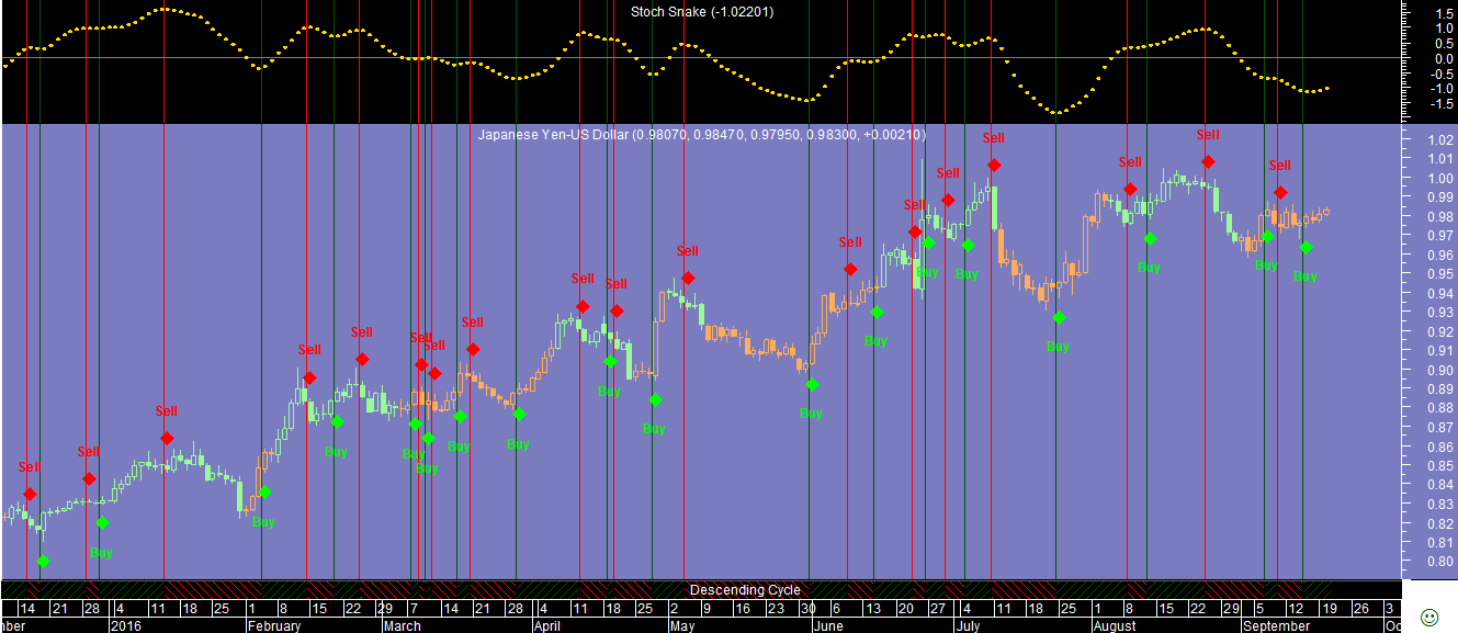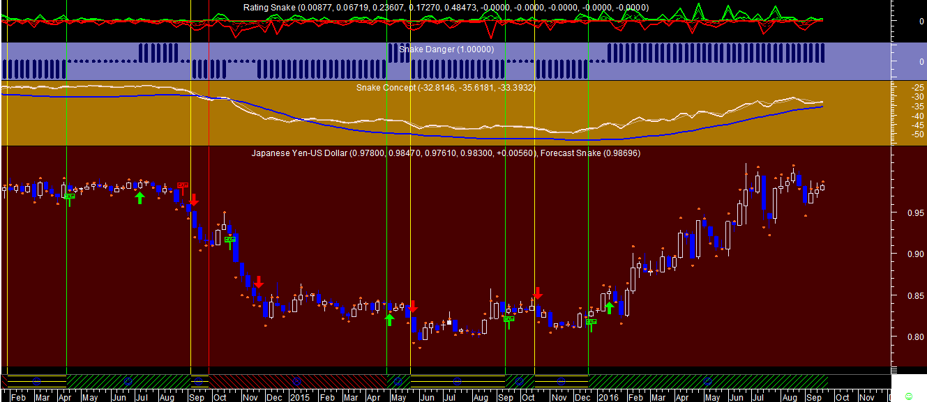 Outro dos papéis que virou de posiçao esta noite, trata-se do que fecha mais tarde em todos os ativos que compoem carteira, foi o par JPYUSD que foi promovido de neutro para comprado em virtude da alteraçao do sinal verificado no gráfico diário da componente tendencial: