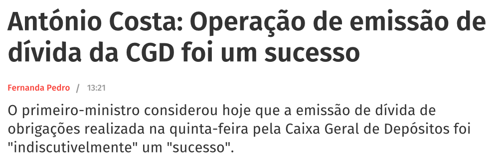 Ocioso Escreveu:http://www.jornaleconomico.sapo.pt/noticias/antonio-costa-operacao-de-emissao-de-divida-da-cgd-foi-um-sucesso-137959