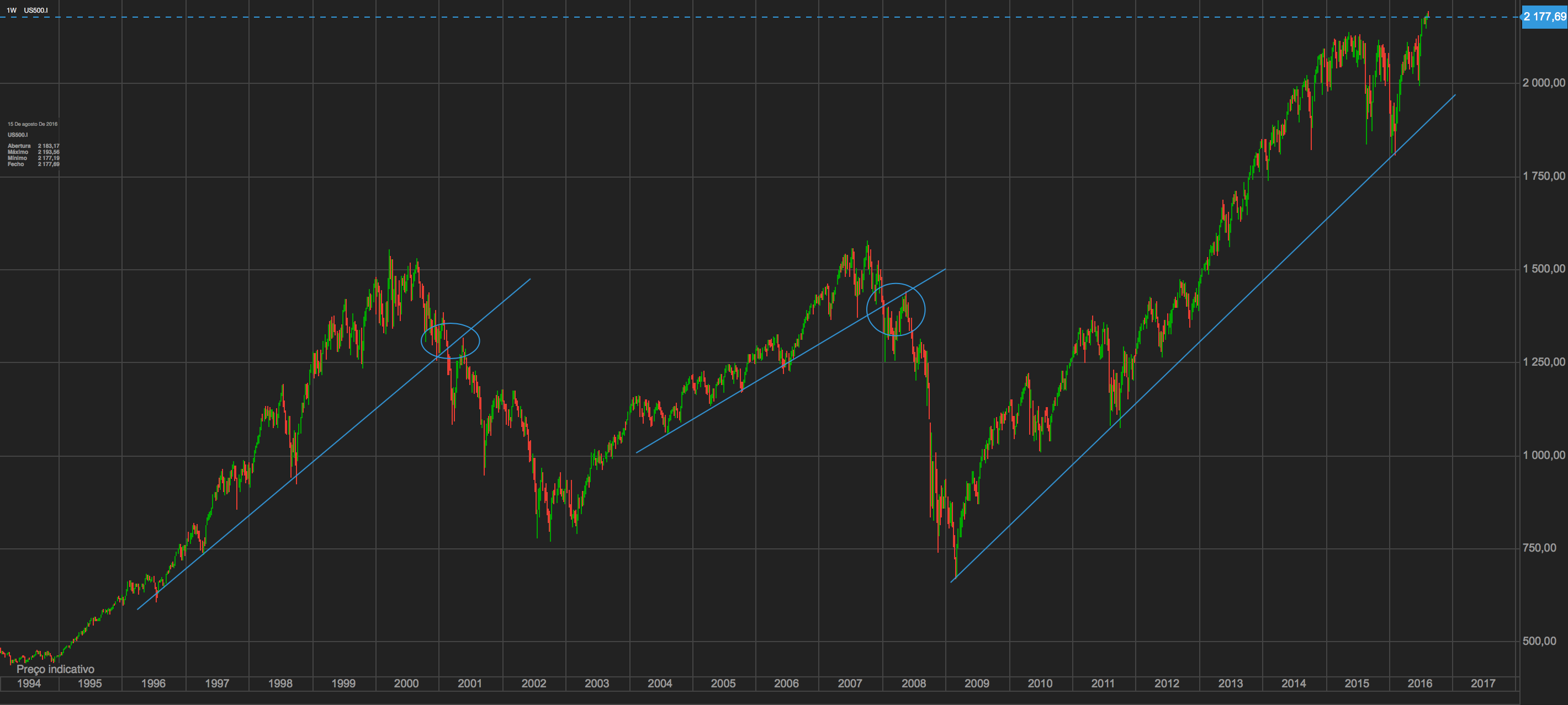 Por outro lado não me acredito que no próximo crash o S&P venha para os 800 pontos, como nos últimos. Deverá parar na zona dos 1500 pontos, que foram os máximos dos outros major bull markets indicados.