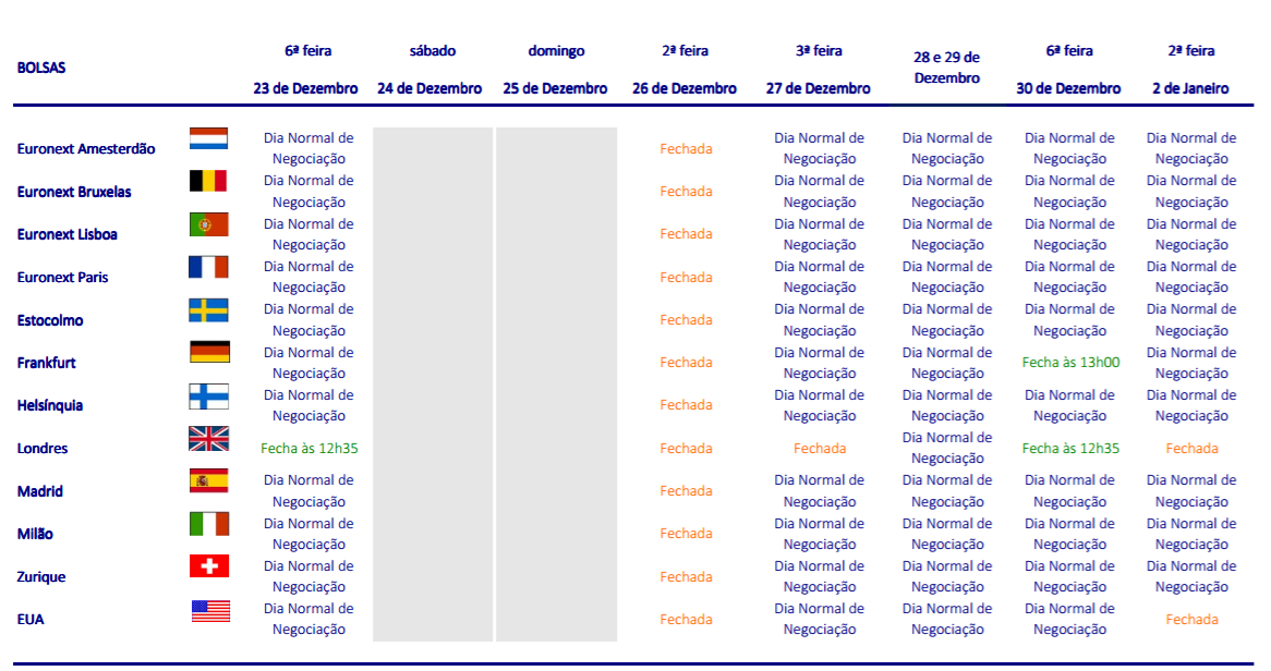 Alguma alma caridosa pode informar eventuais restriçoes de horários dos diferentes mercados de açoes e futuros durante este período entre 26 de dezembro a 2 de janeiro? Ou funciona tudo como se nada se passasse?