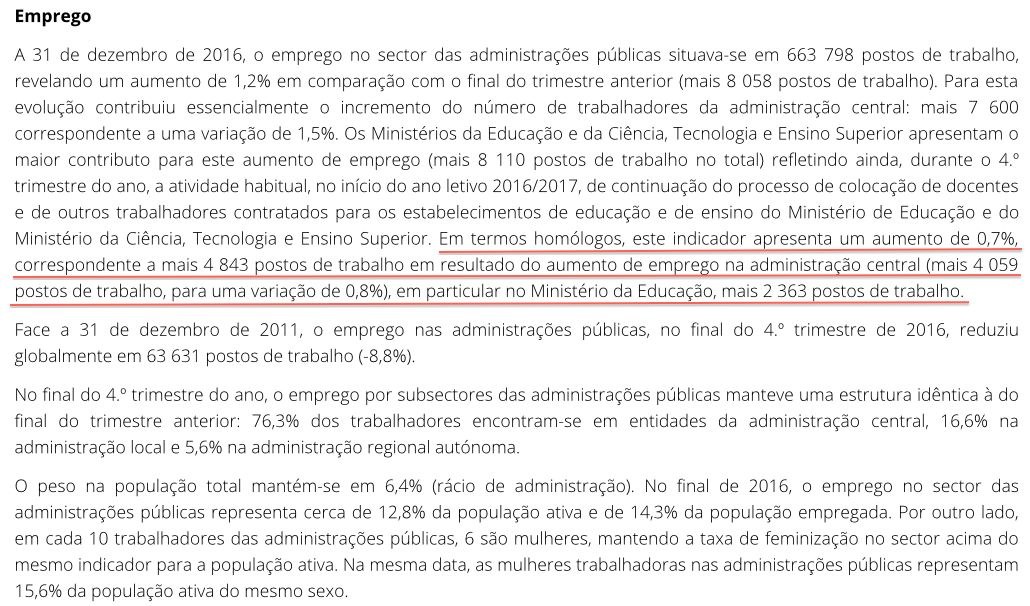 Face a 31 de dezembro de 2011, o emprego nas administrações públicas, no final do 4.º trimestre de 2016, reduziu globalmente em 63 631 postos de trabalho (-8,8%).