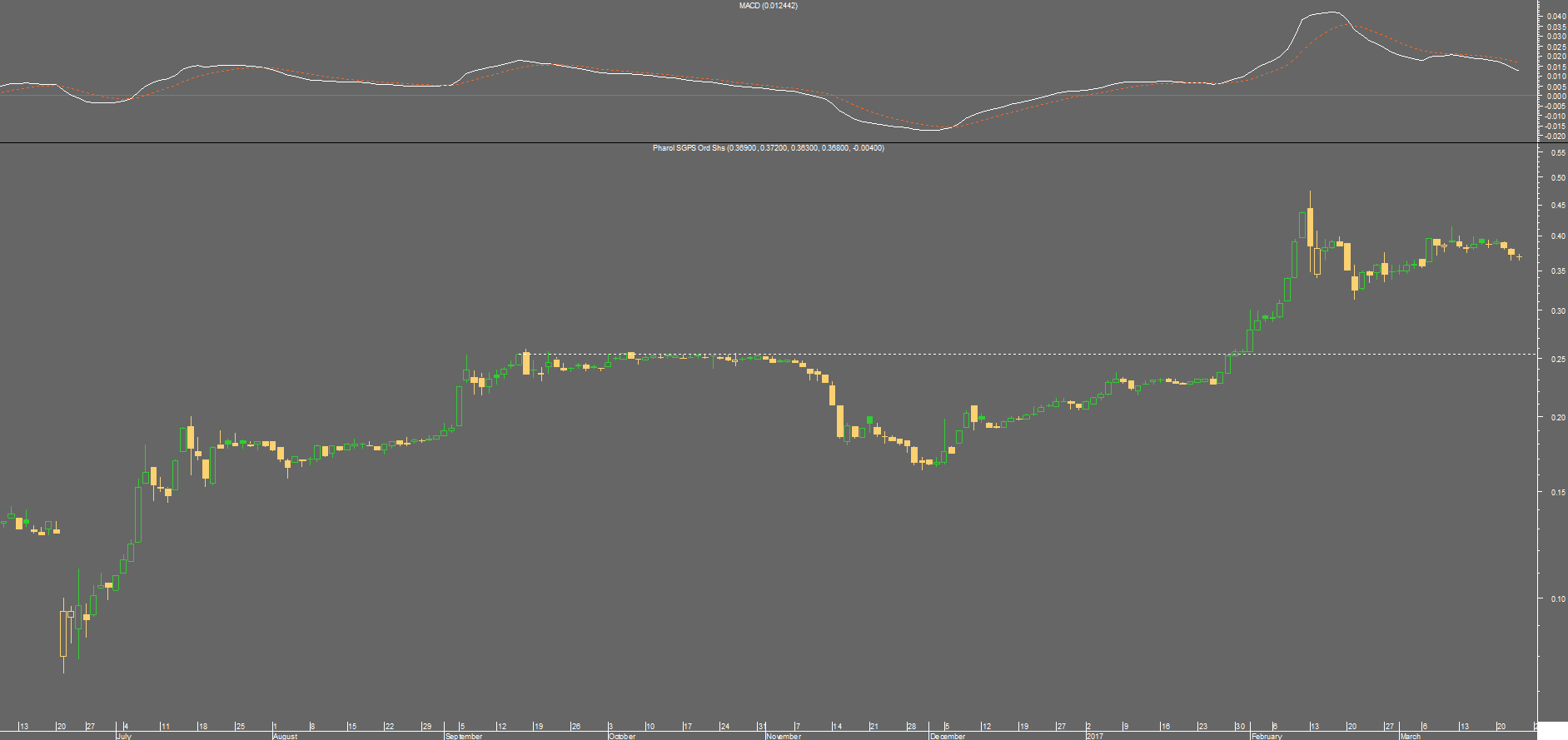 Penaforte Escreveu:Já agora em termos de MACD, na Pharol diria que pode haver um pequeno sinal pois apesar de ter decaído ligeiramente com a aproximação à resistência, parece estar a curvar e histograma a inverter. Mas é um indicador que não utilizo nas análises.