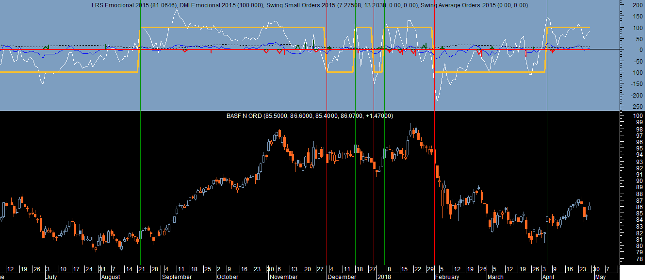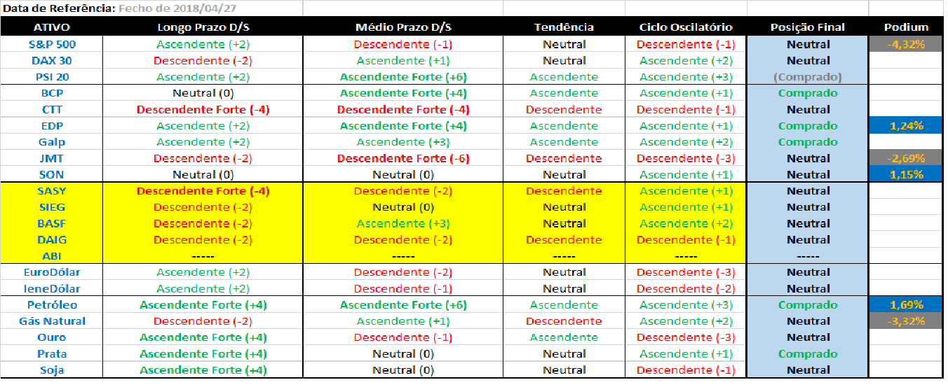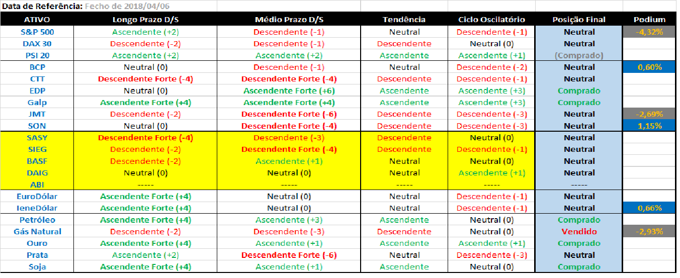 Basta que duas das colunas em cada papel tenham referências de compra ou de venda para avançar com as posiçöes indicadas. Por vezes aparecem células com a indicaçäo de “Neutral” e com coloraçäo verde ou vermelha que significam que os sinais de “Comprado” ou “Vendido” poderäo estar próximos de aparecer em breve.