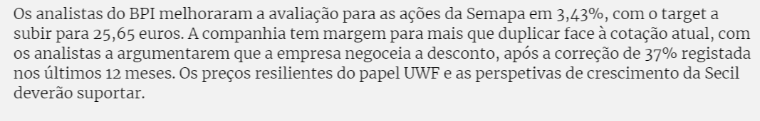 De férias tenho um pouco mais de tempo para olhar para a Bolsa ... assim olhei para o panorana fiz uns "screenings":Valorizacao actual vs . Potencial de subida e depois de umas analises escolhi a SEMAPA que: