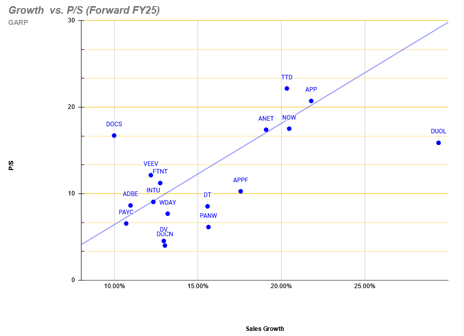 Duolingo, Appfolio e Palo Alto Networks aperecem como mais baratas, mas atenção que este gráfico não leva em conta as margens.