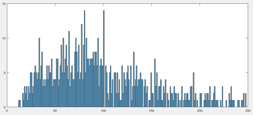 No exemplo encontra-se a distribuição da primeira retracção/expansão para cada swing sobre todo o histórico para dois títulos (Microsoft e Apple). O histograma está a utilizar bins de 1%, estando truncado a 250%. Nada salta à vista nos famigerados valores de Fibonacci.