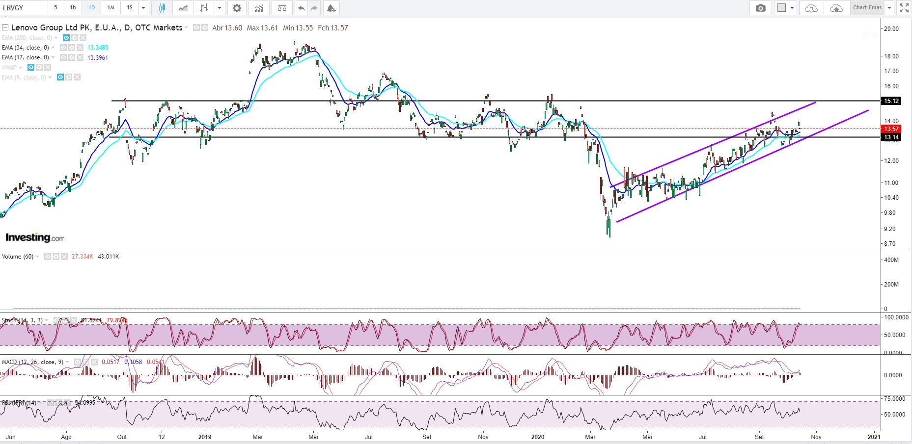 Enquanto respeitar o canal ascendente deve chegar muito próximo dos 15$. Certamente a Lenovo na zona dos 15$ terá alguma dificuldade em evoluir para lá desta resistência a curto prazo.