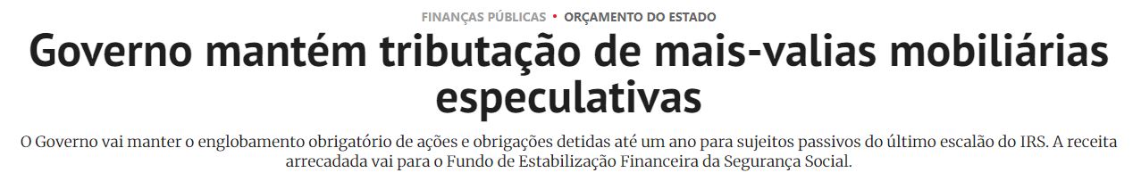 Se alguém do Negócios lê isto, não seria má ideia darem o nome adequado ao bovino, mais valias de curto prazo, as quais têm uma utilidade muito própria em qualquer portfolio de uma pessoa individual, que será penalizada via este OE ao contrário de outros investidores institucionais bem como de outros locais no mundo onde poderão continuar a investir livremente sem qualquer questão fiscal relacionada com o horizonte temporal dos investimentos. Bem sei que várias jurisdições possuem taxas distintas para mais valias de curto prazo, mas é importante cruzar que elas são zero em muitas dessas jurisdições se realizadas em contas poupança reforma geridas pela própria pessoa, e que são zero até atingirem volumes muito elevados, o que não é o caso aqui, pois qualquer português com um salário médio/baixo em padrão europeu pertence ao último escalão de IRS e as mais valias são taxadas a partir de zero, se tiver 1 cêntimo pago.