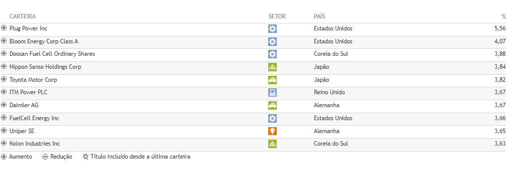 Acrescento que do ETF acima, só recente incluíram a FuelCell Energy Inc (FCEL). Mas já tinha a Bloom Energy Corporation aqui falada no forum.