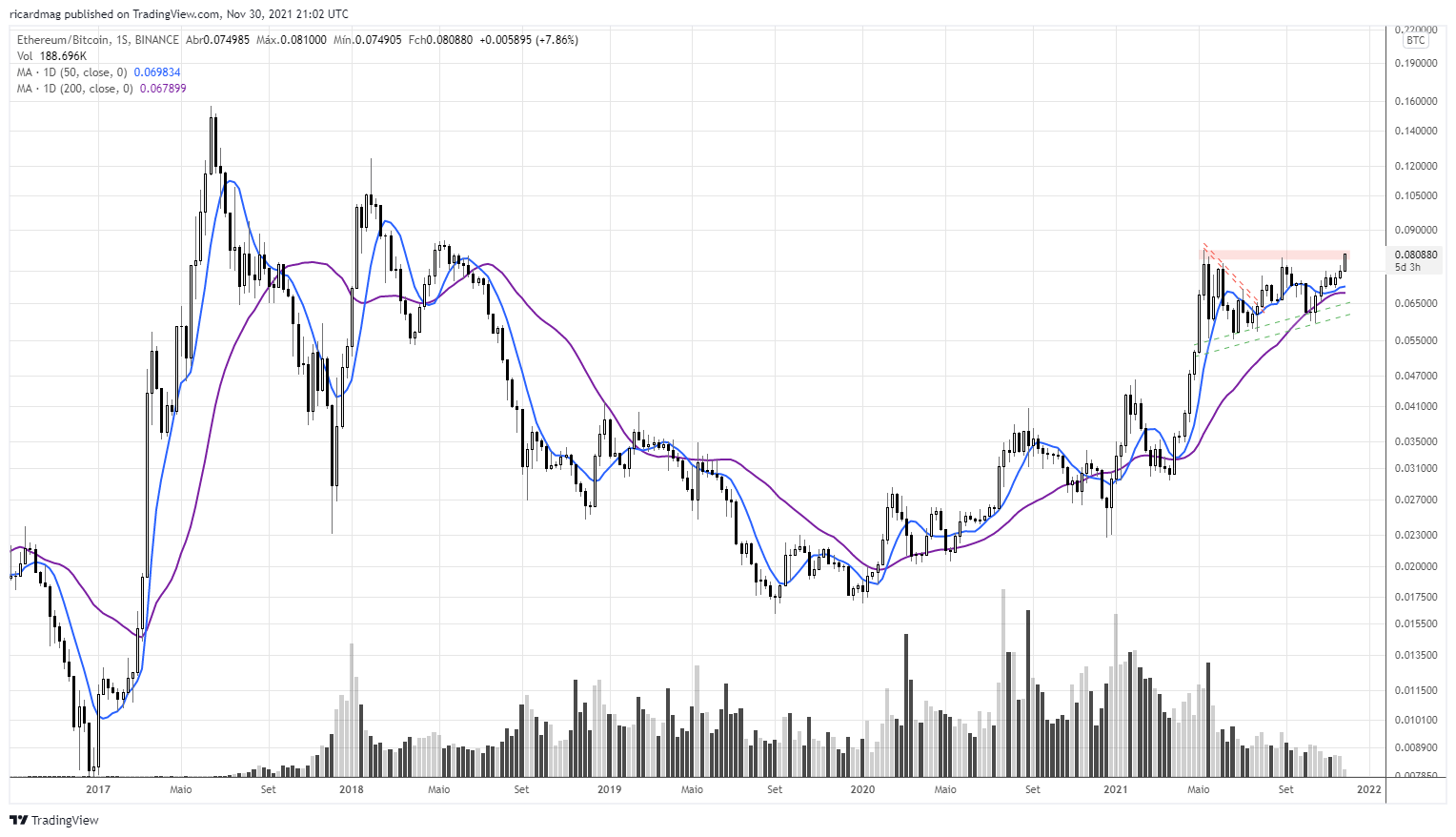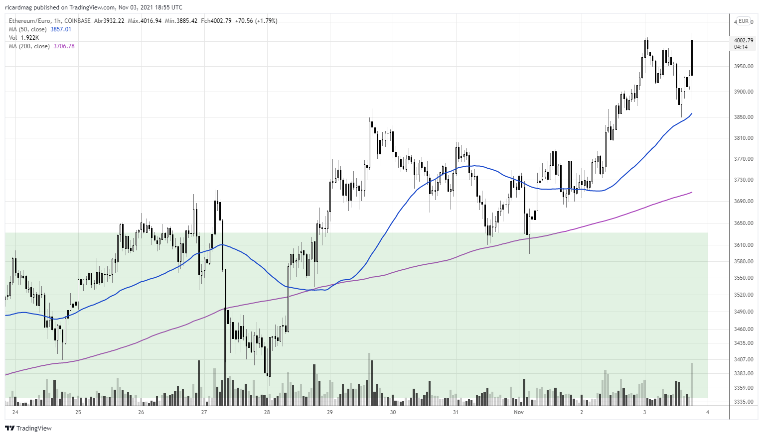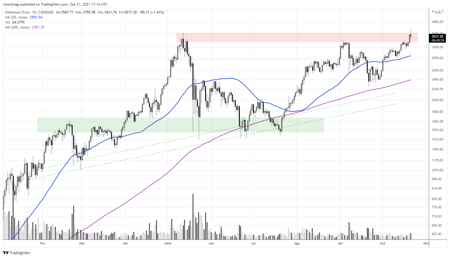deixo abiaxo dois gráficos da eth, já com alguns dias(de 10-10-21), e a respectiva análise técnica.