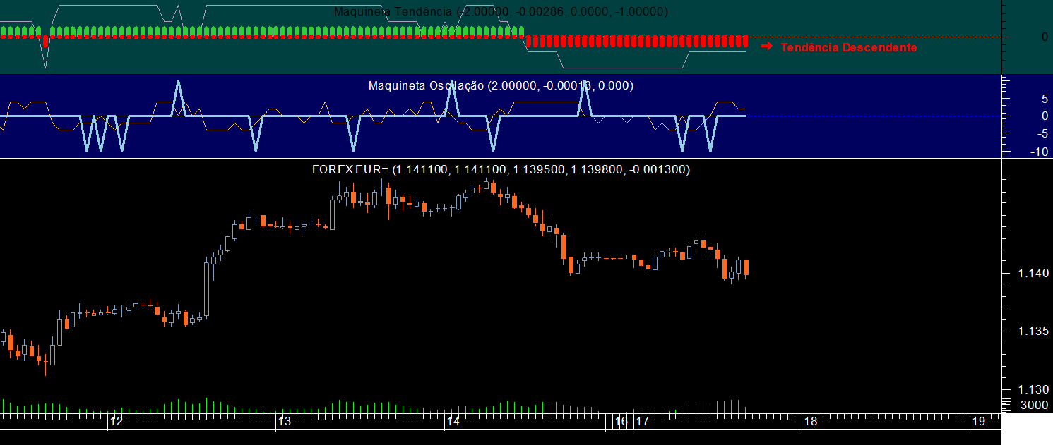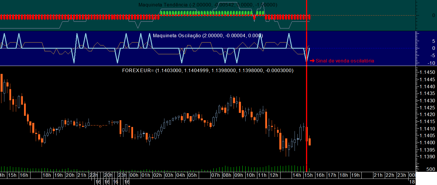 Aqui está o primeiro exemplo, executado no par EuroDollar: venda a 1,1402 às 15h 15m por sinal disparado no gráfico de 15 minutos e confirmado pela tendência descendente no gráfico horário.