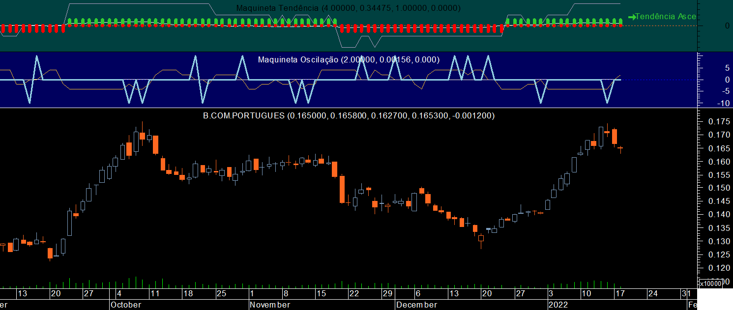 Abertura de posições longas ou compradas no BCP a 0,1654 por disparo de sinal de compra oscilatória no gráfico horário às 10h 00m.