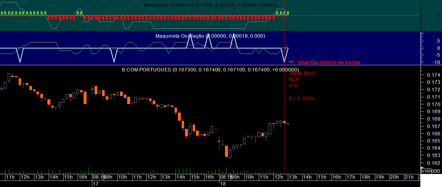 Abertura de posições curtas no BCP, por disparo de sinal de venda oscilatório no gráfico de 15 minutos a 0.1674, confirmado pela tendência descendente no gráfico horário.