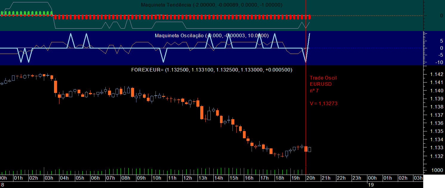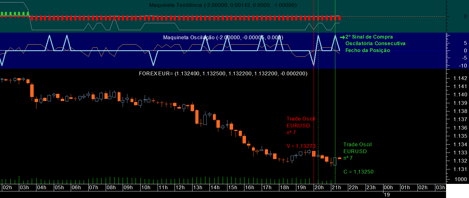 Fecho da posição curta ao ser disparado ao mercado no valor de 1,1325 o 2º sinal de compra oscilatório consecutivo no gráfico de 15 minutos no EuroDollar.