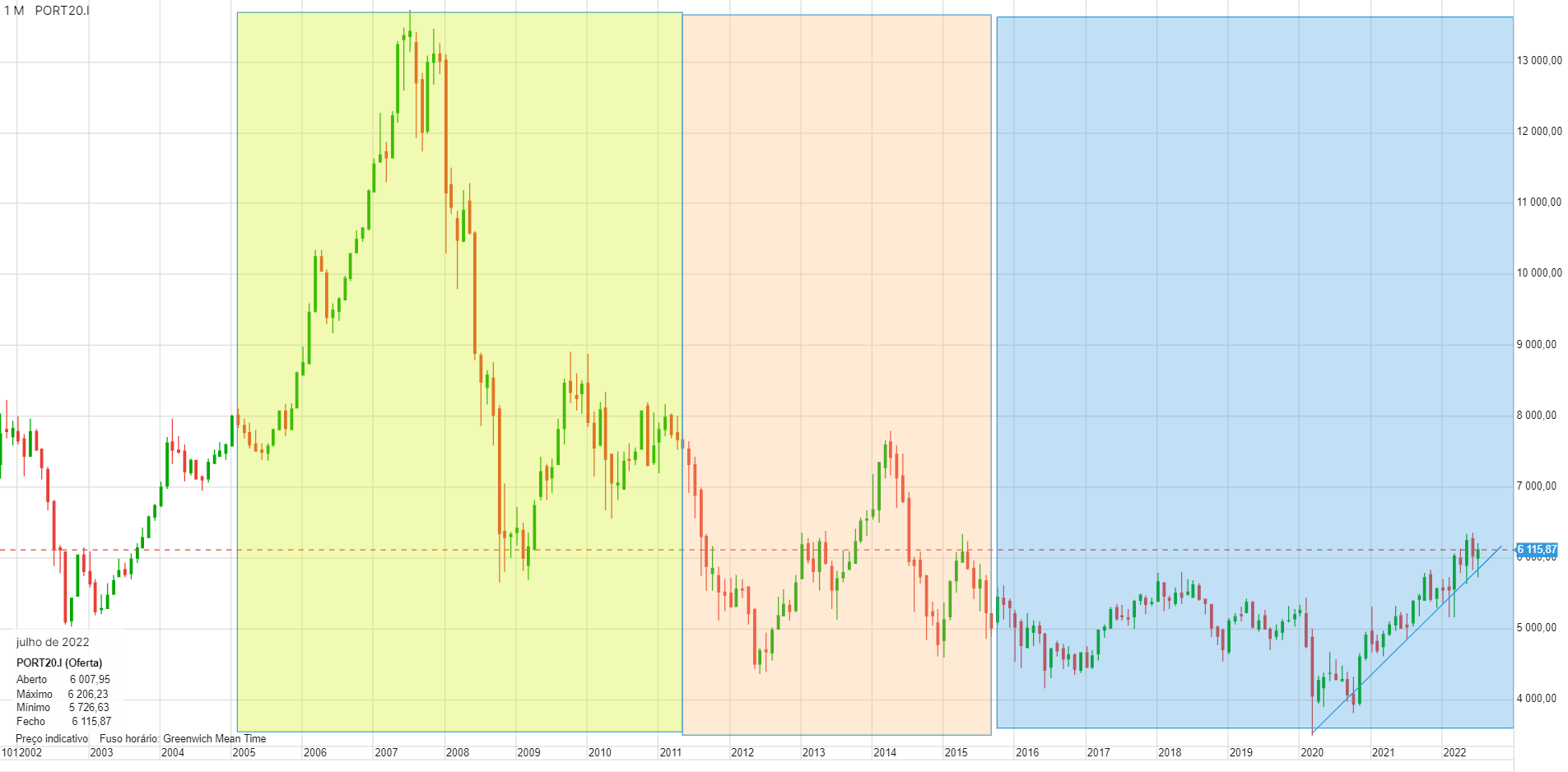 Apenas por curiosidade, coloco um gráfico do PSI-20 e os períodos dos últimos governos.