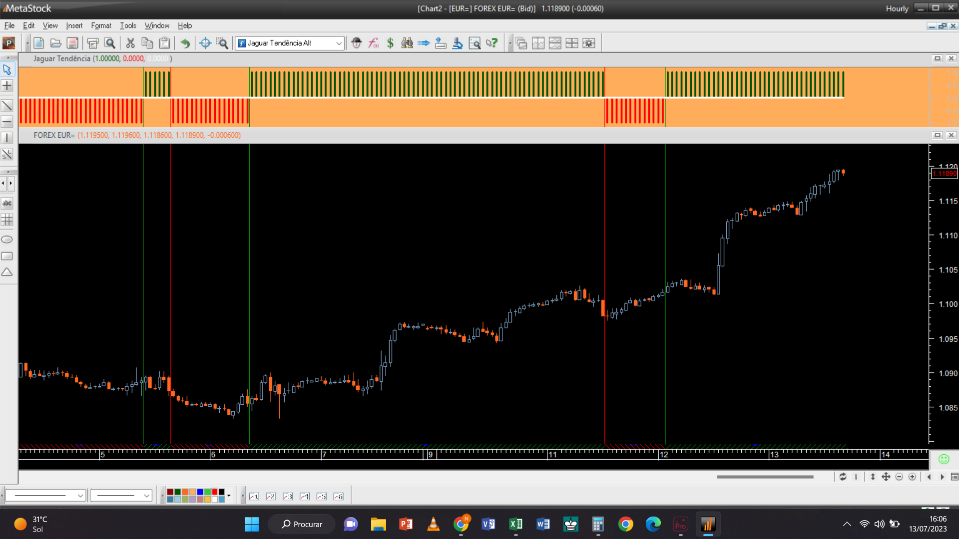 Para terem uma ideia de indicadores técnicos que permitam obter alguma rapidez nos sinais de viragem dos mercados, deixo abaixo o exemplo do meu sistema de trading atual no capítulo dos indicadores tendenciais nos casos do trading semanal e horário sobre o par Euro/Dollar.