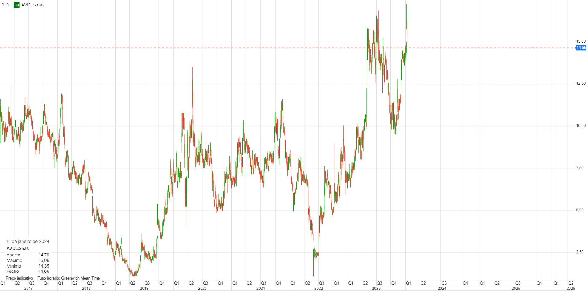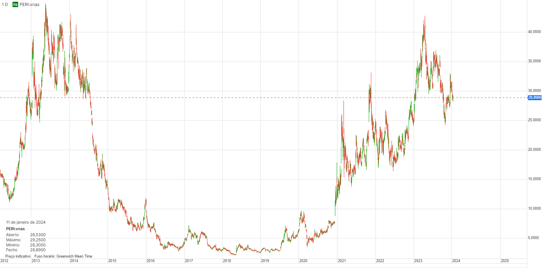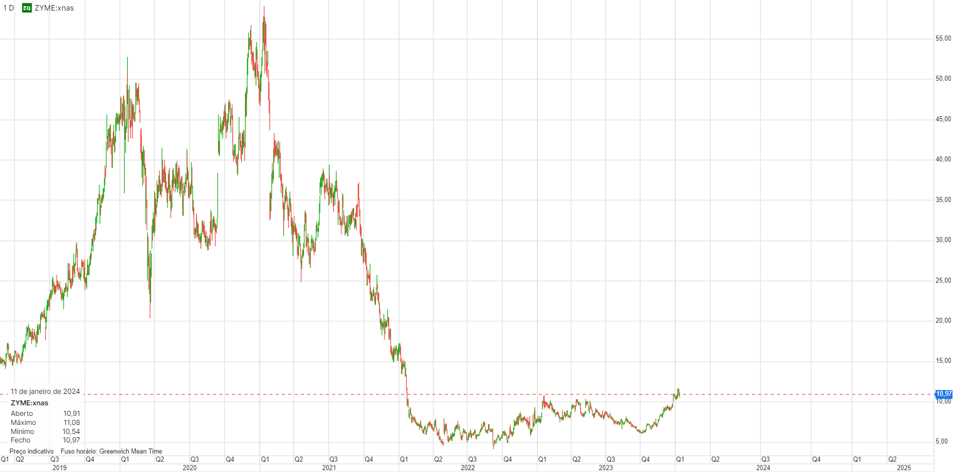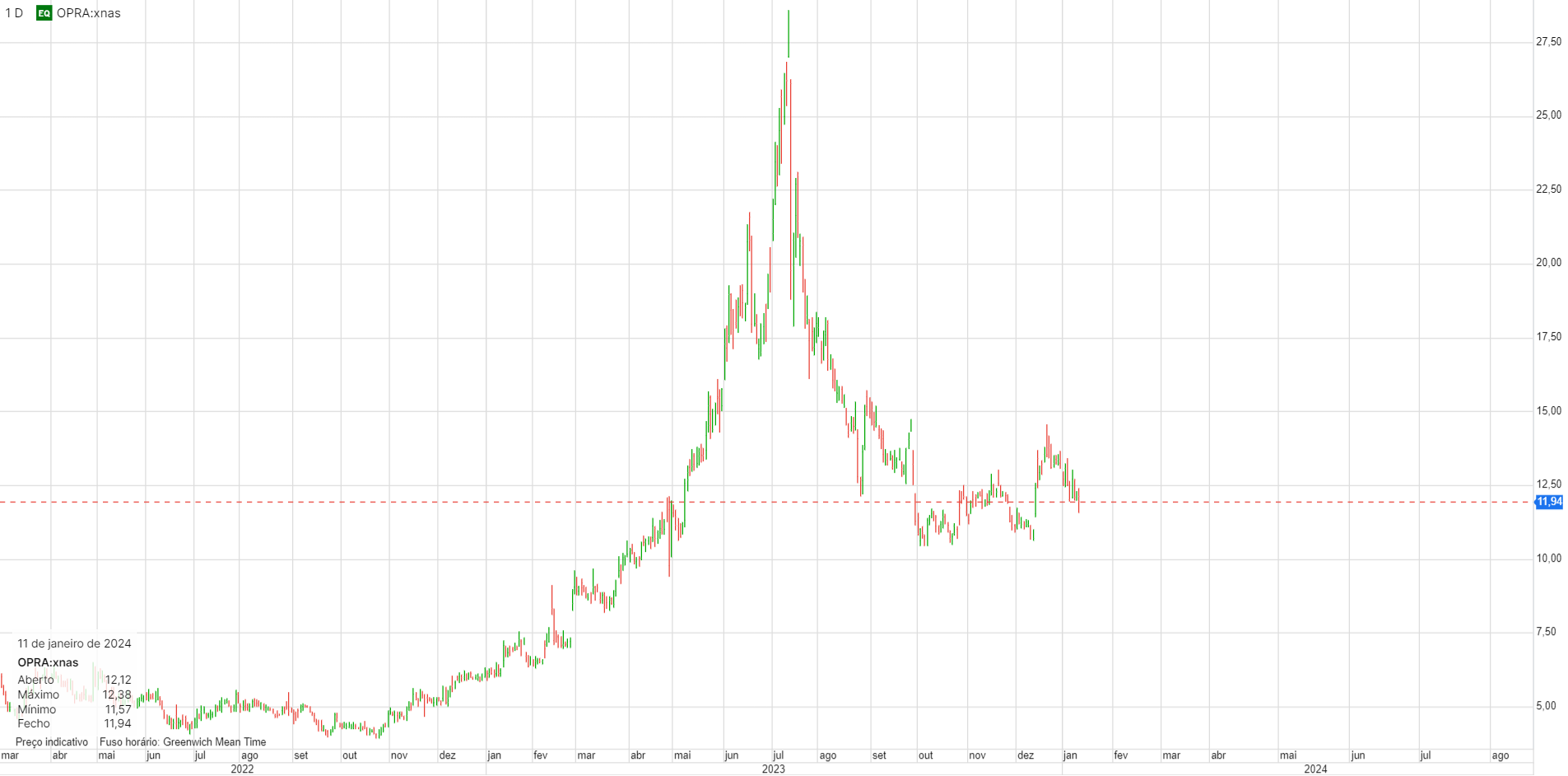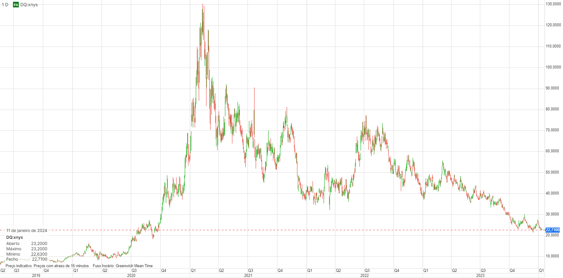 Vem de uma longa queda, estabilizou durante algum tempo e depois disso, no último meio ano já subiu 1000%
