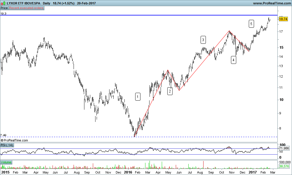 Atenção que eu nunca estudei Elliott Wave com o mínimo de profundidade.. os movimentos ascendentes que o índice brasileiro iniciou a Janeiro de 2016 é que me recordaram o tipo de movimento em "5 ondas". Sei que Elliott Wave pressupõe bastante mais complexidade do que o explanado no gráfico, daí o meu apelo a quem já estudou mais sobre esta "Teoria".