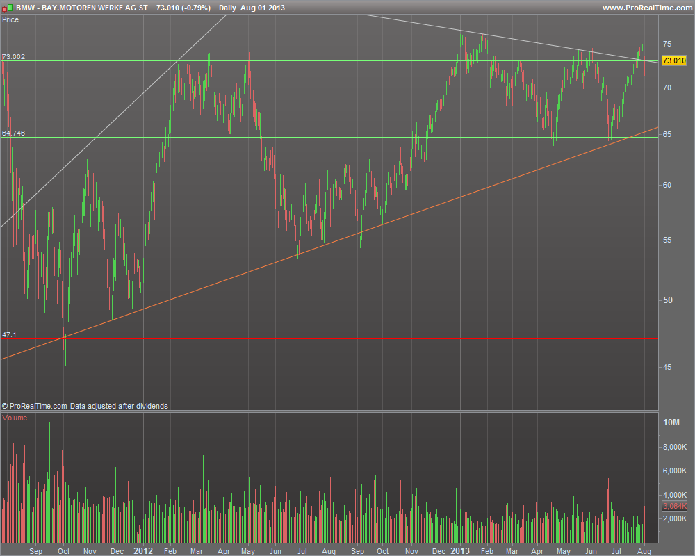 E desde esse dia até hoje nunca mais teve um fecho acima do que falou o Axe River em janeiro... Depois de um período de consolidação de 7 meses (no qual me parece possível desenhar-se a LTD de MP representada) a BMW, que continua a respeitar a LTA de LP (a laranja) parece pronta a dar um ar da sua graça e atingir máximos históricos.