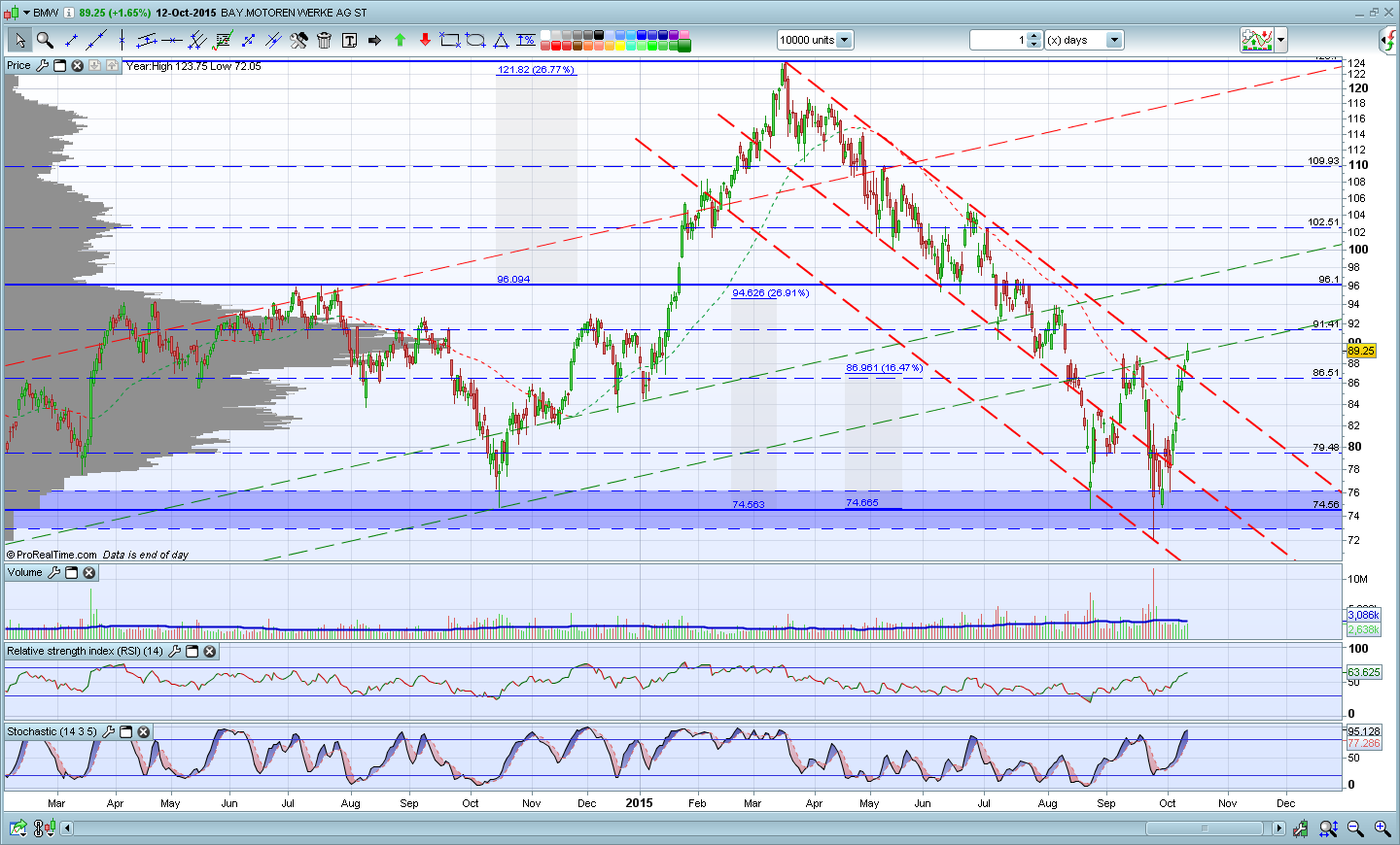 A BMW está bull em todos os horizontes temporais, especialmente desde que rompeu a resistência histórica dos 76 euros. Está agora em território não explorado, sendo por isso difícil identificar referências concretas. A mais importante está justamente nos 76 euros, que eram resistência e passaram agora a ser um suporte.