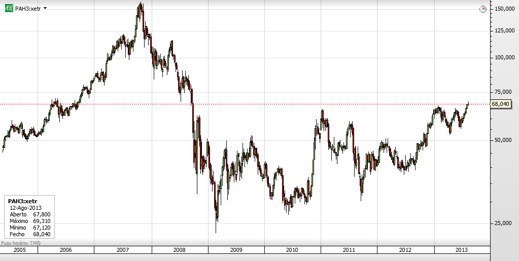 A Porsche segue em máximos de quase 3 anos. Poderá encontrar algumas dificuldades na zona dos 75 (pico de Janeiro de 2011).