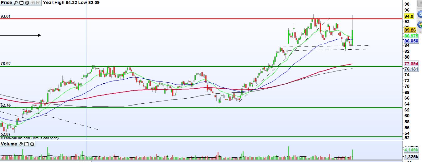 Adidas tem agora pela frente a zona de resistência dos 87.5 - se a superar, entrará em "unchartered territory".