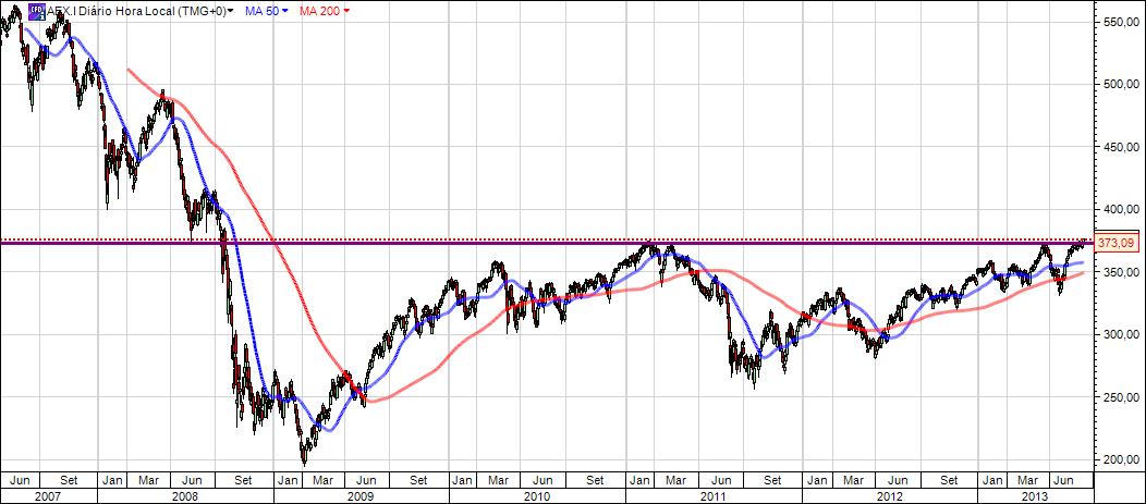O valor-chave a observar neste gráfico são os 373 pontos (linha a traço interrompido). Este valor serviu de suporte em Julho de 2008, foi quebrado dois meses mais tarde e posteriormente funcionou como resistência em diversas ocasiões (nomeadamente em 2011 e 2013).