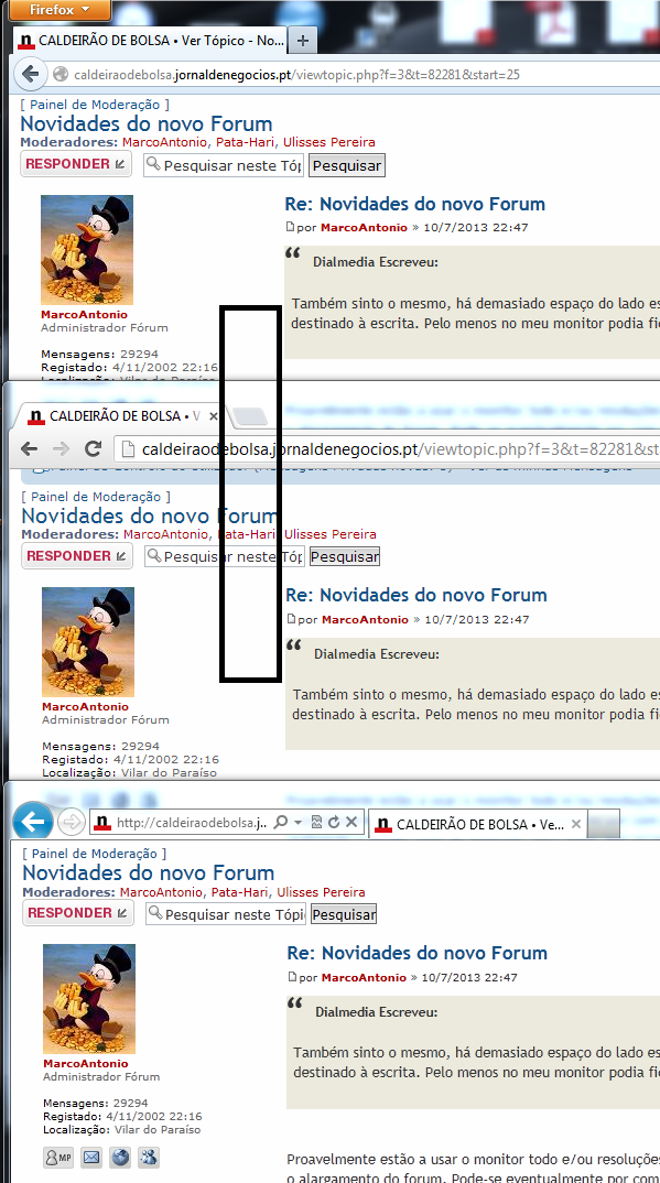 Já se concluiu que é necessário fixar a largura para não alargar com o browser. O valor da largura fixa poderá ainda ser eventualmente um pouco menos que a actual largura mínima que agora tem (o que os meus printscreens mostram é a actual largura mínima, para veres como é que fica terás de desmaximizar o browser e reduzir a largura até o forum - e a coluna dos avatares - parar de estreitar).