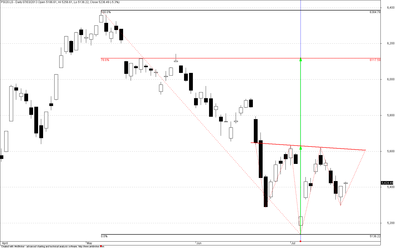 Mas, não estou convencido de que o PSI vá concluir o target do duplo topo. Ainda penso que o PSI não vai descer inferior ao máximo do dia 3 de Julho, 5256,61. Veremos...