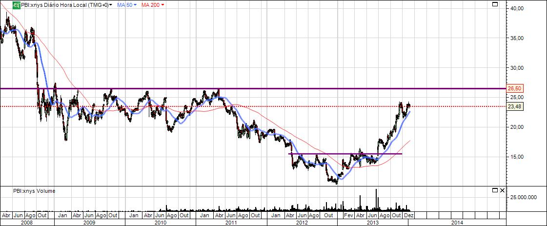 Em Janeiro deste ano a PBI quebrou em alta a LTD que definia a tendencia desde 2011, e encontra-se agora junto da resistencia na zona dos 15,25$. Este é o valor que tem impedido o título de rumar a norte desde Maio 2012. Será que à 3ª é de vez?