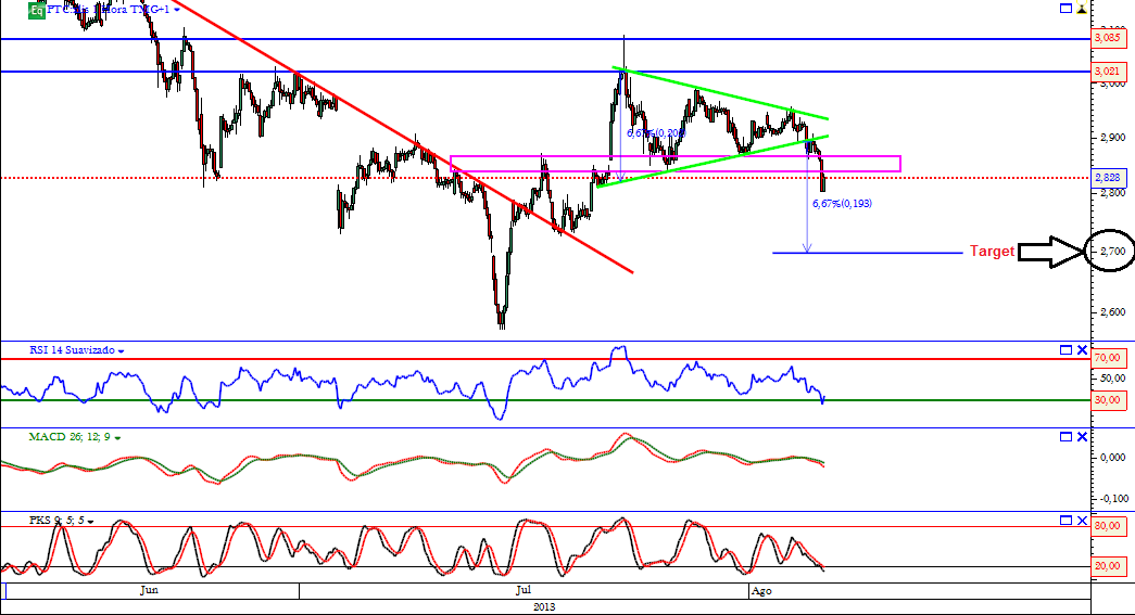 A ideia que tenho é que a PT está a fazer no diário um triangulo descendente.Não chamo a isto bandeira pois aquele mastro é muito manhoso.Caso fure em baixa os 2,82x o mais certo é vir de novo aos 2,72x.