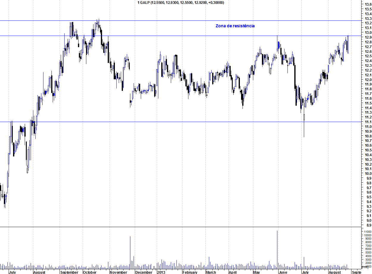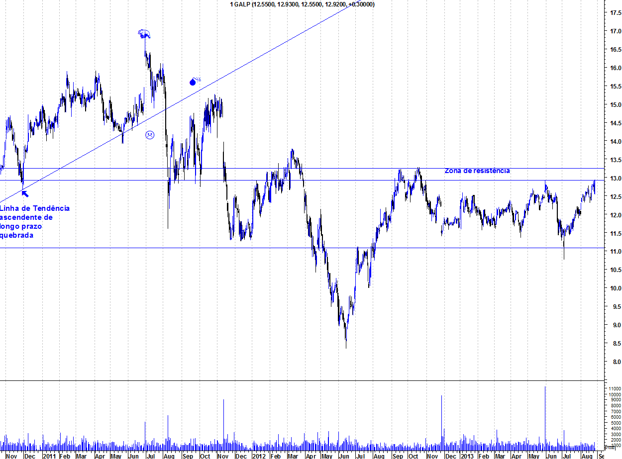 Actualmente estamos próximos de um momento técnico decisivo para a Galp. Nos próximos dias irá visitar o topo do canal e, com sorte, testar a forte zona de resistência. Se o seu comportamento mantiver o padrão tradicional, a cotação cairá ao entrar em contacto com essa zona. Se não cair, uma ida consistente aos 13,5€ poderia dar um forte sinal de inversão na tendência de longo prazo. Repare-se que não existem alterações no volume correspondente a esta subida, o que nos indica uma enorme falta de força, força que seria fundamental para romper o canal em alta.