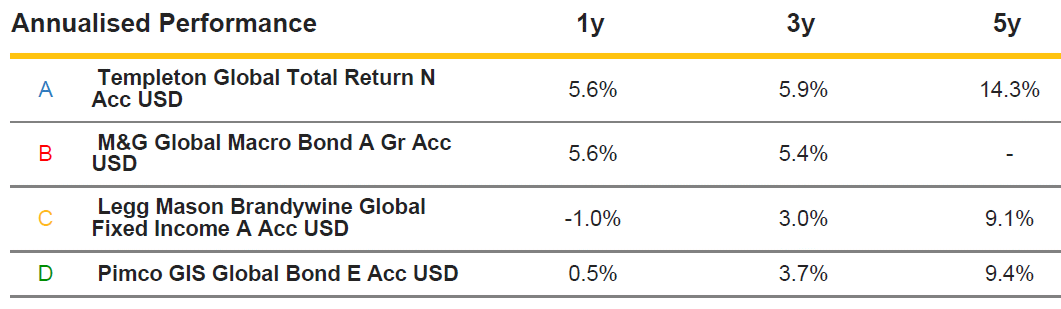 A minha questão do M&G Global Macro vs. os outros fundos globais foi um teaser. :mrgreen: Já tinha reparado que ele tinha na carteira, a maioria em obrigações de alta qualidade e de curto prazo, mas estranhei o desempenho dele estar mais perto do Templeton TR do que dos fundos mais conservadores como ele. Usei as versões destes fundos em USD Acc para conseguir ter todos os fundos na mesma categoria, Obrigações Globais (USD Acc):