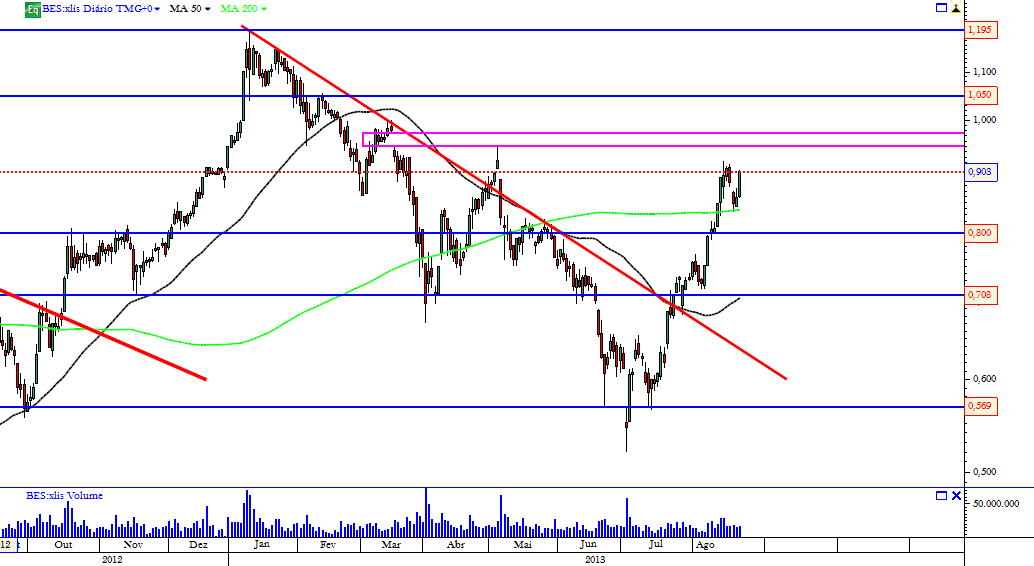 Qual parece ser agora a grande resistência do BES? Os 0,92€ de 15 de Agosto ou os 0,95€ de Maio? Bem sei que primeiro terá de passar pelos 0,92 para chegar aos 0,95, mas gostava de saber opiniões acerca da força das próximas resistências.