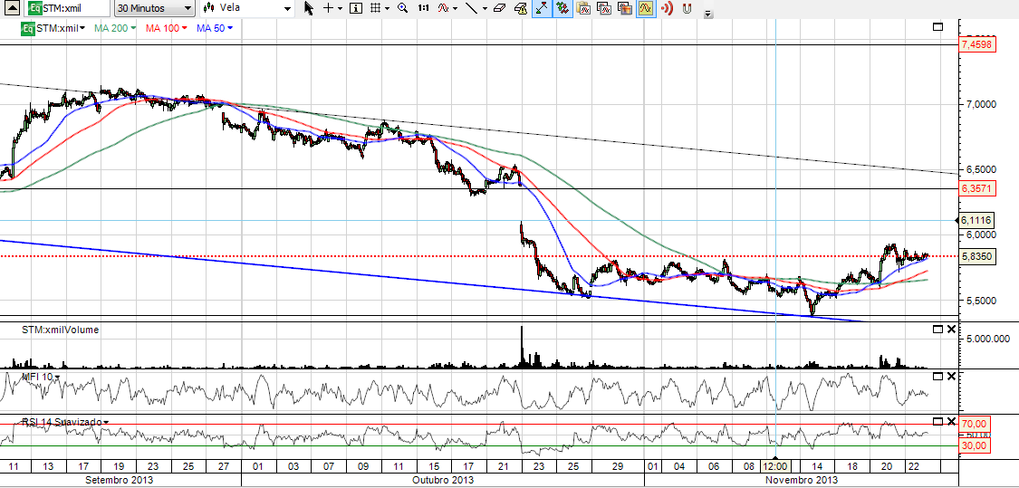 NO caso da STM o que vemos é uma tendência de muito curto prazo ascendente (gráfico de 30 minutos) e uma tendência de médio prazo descendente (gráfico diário).