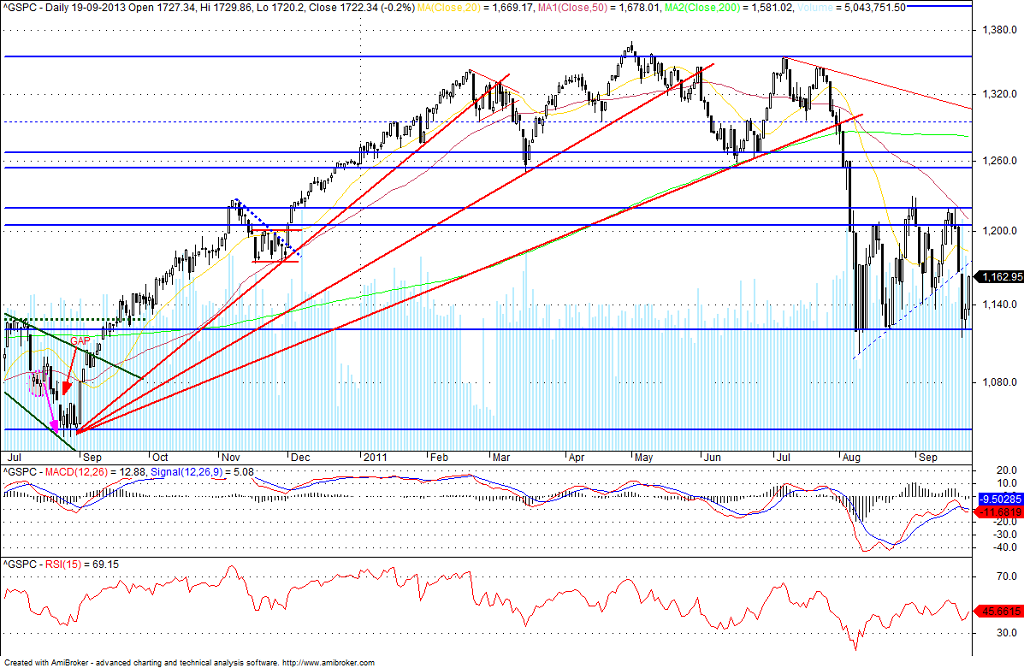 A teoria das pás ventiladoras pode ser bastante discutível, de fácil desmontagem, mas na minha opinião de tempos em tempos, são figuras que nos dão uma possível orientação para qual vai ser o rumo dos mercados. No gráfico de longo prazo deixo alguns exemplos onde elas foram formadas e depois é só ver o resultado. As pás ventiladoras ascendentes funcionam de uma forma mais rápida. As pás descendentes têm um periodo de formação bem mais alargado, e a quando da formação das várias linhas muitas vezes podem surgir figuras muito próximas de um H&S.