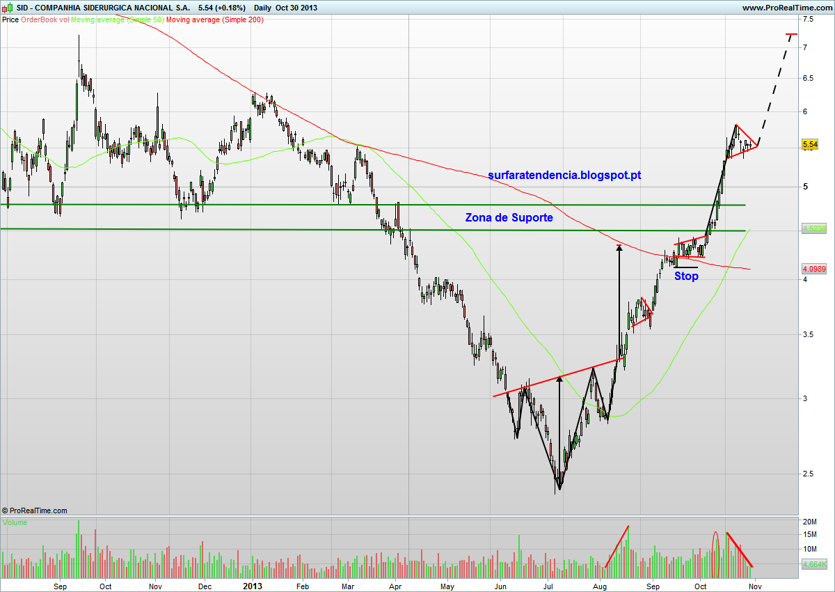 Hoje é dia de update gráfico à SID, num ponto decisivo do seu percurso. Parece estar a desenhar desde a semana passada um congestionamento triangular de continuação, também conhecido como pennant. Os volumes decrescentes ao longo das últimas sessões comprovam essa teoria, esperando-se a ocorrência de uma ruptura para hoje ou amanhã. Ora, se assim for poderemos estar perante uma boa oportunidade para entrar, reforçar ou fazer scaling out. Caso a quebra do padrão seja no sentido ascendente essa quebra poderá oferecer uma boa oportunidade de compra/reforço da posição, já que a projecção aponta para os 7,2€, acima da actual resistência.