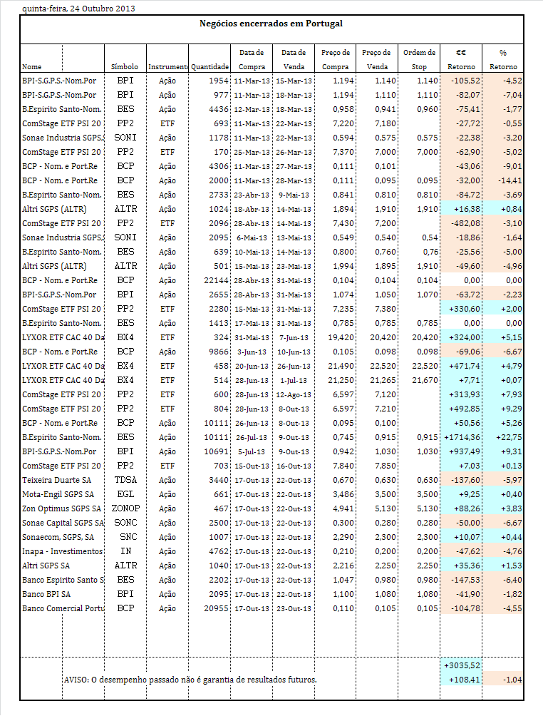 Eu encerrei BCP e PP2 e coloquei ordens de stop em BES e BPI por causa de um número crescente de indicadores técnicos que uso para a negociação de curto prazo estarem a mudar para sinal de venda e de eu ter mais dúvidas do que o habitual sobre a futura direção do mercado no curto prazo.