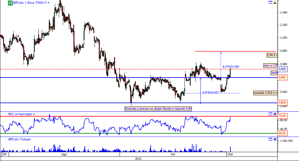 Ao longo da sessão o activo foi sempre em crescendo e ainda por cima com volume a acompanhar (gráfico 1hora) o que levaria a uma vela bullish no diário e ainda por cima como hoje é sexta, também uma vela bullish no semanal com fecho nos máximos (1€).