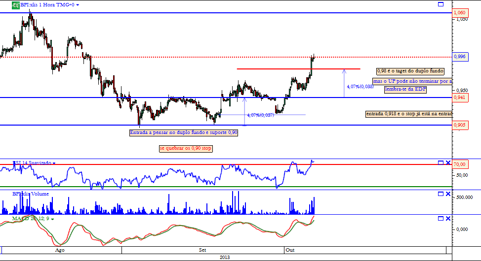 Ainda em relação ao duplo fundo, apesar de ser de curto prazo, o target ter sido atingido, e significar uma inversão de tendência de curto prazo, pode também ter sido o inicio de uma tendência ascendente de médio prazo. Vou deixar além do gráfico semanal, diário e horário do bpi um outro da edp para comparar movimentos idênticos, que apesar de não quererem dizer nada, cada situção é distinta, fica como curiosidade.