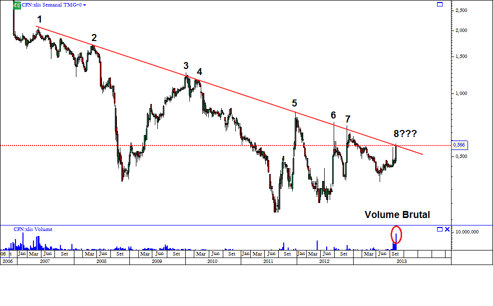 Defendo que uma LTd como esta com quase 7 anos, deve ser analizada num gráfico, no mínimo semanal. Amanhã logo se verá se fecha acima ou não e mesmo que feche acima, necessitara de confirmação para a semana.