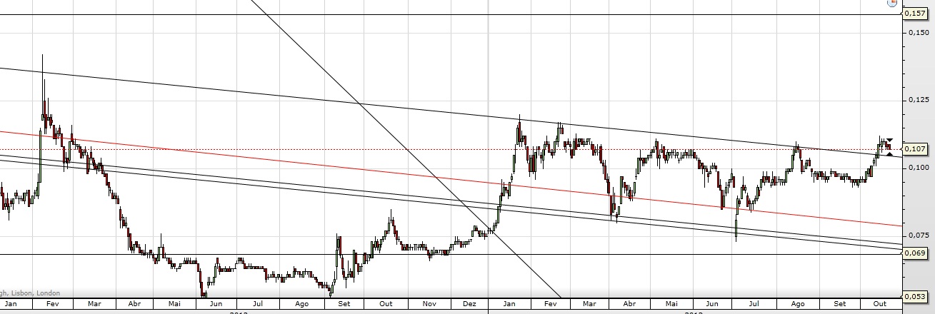 Quebrou o em alta o canal descendente, têm como resistência proxima os 0,16 e suporte os 0,07