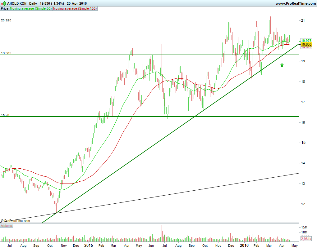 Entrei nesta acção a 01 de Abril, quando tocou nos 19.30 sinalizada na minha opinião como possivel suporte, julgo que está bull em todos os horizontes temporais. Nestes últimos 2 dias teve quedas acentuadas, hoje mesmo já baixou o valor de 19.30. Tenho procurado alguma noticia dos últimos dias sobre a ahold mas não encontro nada de relevante. A minha ideia é estar dentro até atingir novamente valores máximos históricos e saltar fora caso quebre a lta por mim assinalada e fecho abaixo dos 19.30, estes dois factores juntos fazem-me sair fora.