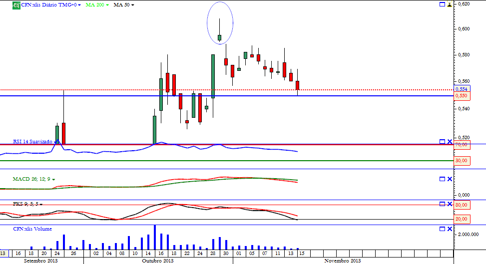 Embora a vela de hoje revele muito pouca força compradora, o suporte que tinha estabelecido fica nos 0,55€. Vamos ver para onde caminha na próxima semana, se bem que o cenário se esteja a tornar pouco interessante para quem está dentro e longo.