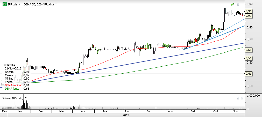 Tomada de mais valias, o preço estagnou na zona 0,90/0,94 parece haver grande desinteresse neste momento pelo titulo. No longo prazo continua Bullish, qualquer sinal de força será motivo para novas entradas.