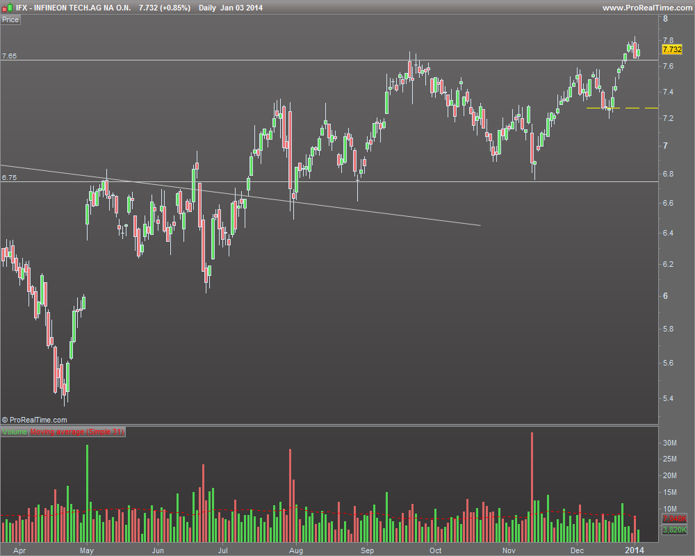 A Infineon tem uma fatia de leão da carteira. Este papel teve um um comportamento atípico no final de 2011 princípios de 2012, quando a generalidade das cotadas faziam mínimos, aguentando-se numa longa lateralização entre os 5,x e os 8,x euros, o que só por si indica alguma força relativa. O fim confirmado desta lateralização será a quebra em alta dos 8,3, máximos deste período. Para já, depois de ter quebrado a resistência dos 6,75 a IFX debate-se com os 7,65 estando para já a mostrar uma boa reação à quebra marginal do final de ano.